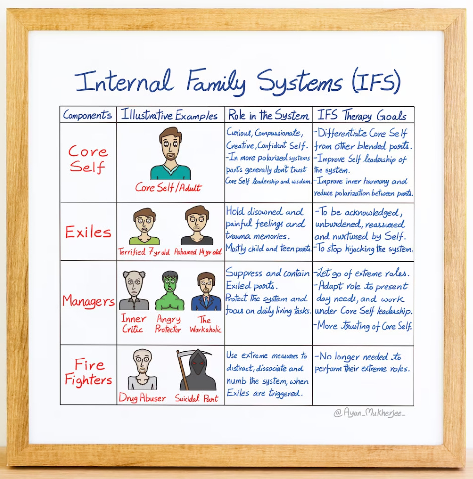 Have you heard of Internal Family Systems (IFS)? It’s a psychotherapy model that views the mind as one of several sub-personalities or parts, each with their own functions.