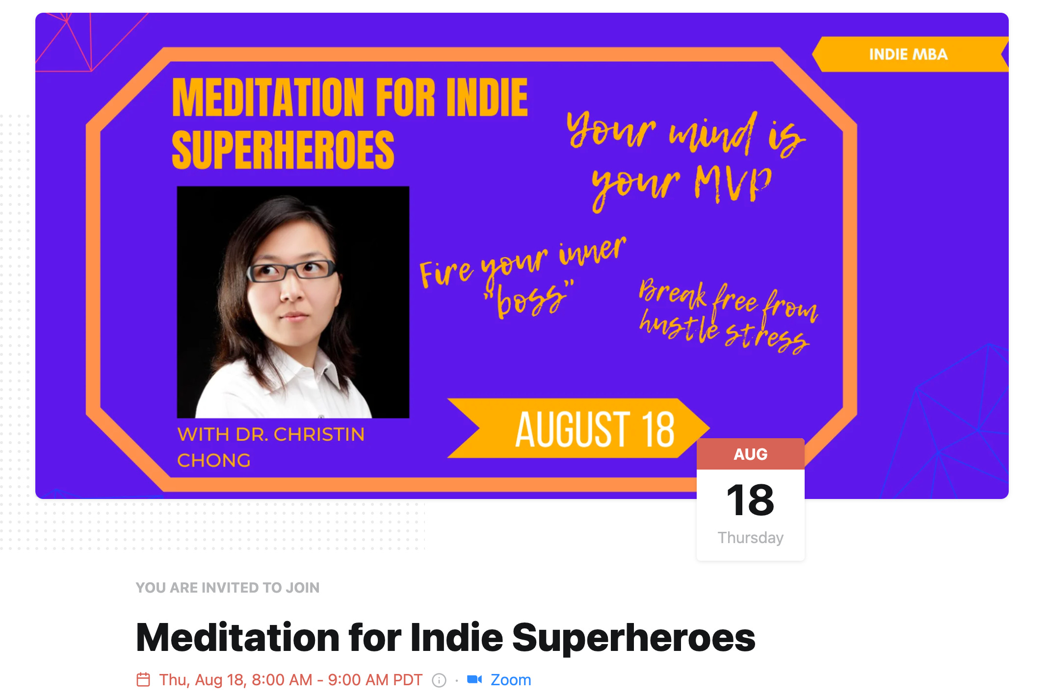 You are the first to know about this workshop! It’s the first of its kind where I talk about how creators can use their EXISTING skills to meditate, without having to learn anything. I think there’s way too many workshops these days and even I am tired of learning. So this is a way to “learn” without…having to work any harder. Isn’t it neat?